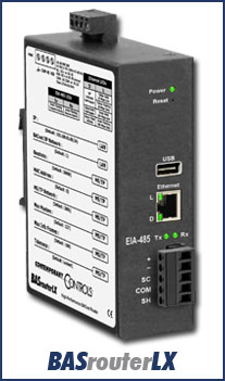 The BASrouterLX is a high-performance BACnet router providing stand-alone routing between BACnet networks such as BACnet/IP, BACnet Ethernet (ISO 8802-3), and BACnet MS/TP. Besides its high-speed processor, it has advanced features such as MS/TP Backbone, Backward Routing, Allowlist option for enhanced security, MS/TP slave proxy support (allowing auto-discovery of MS/TP slaves) and MS/TP frame capture and storage for use with Wireshark®. As a BBMD, up to 50 BDT and 147 FDR entries can be supported. The BASrouterLX has two physical communication ports — a 10/100 Mbps BACnet/IP Ethernet port and an optically-isolated EIA-485 port for MS/TP. Router configuration is accomplished via web pages.