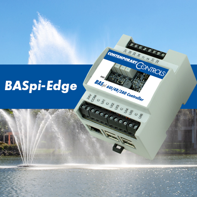 The BASpi-Edge provided the affordable and compact solution to control the fountains at a university. The schedule of the pumps and lights for the fountains were controlled by an electronic timer, but integration to the Building Management System (BMS) was difficult due to the lack of conduit for low voltage wires to the electrical/control panel. Using a BASpi-Edge with BACnet/IP over Wi-Fi allowed the integration of the fountains to the BMS.