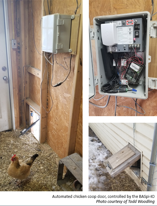 The chicken coop was within his Wi-Fi network, so Woodling was able to take advantage of the fact that the BASpi-IO can be programmed and interfaced via Wi-Fi, unlike most building controllers. By utilizing the BASpi's built-in web server, Woodling can now activate the closing of the door from a webpage and can verify the door is closed by using a limit switch attached to one of the BASpi-IO's universal inputs. Another universal input was used to attach a thermistor for monitoring coop temperature.