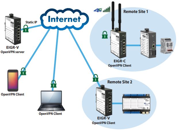 For single-site, remote access solutions, Contemporary Controls also offers a BridgeVPN solution which utilizes the EIGR-VB Gigabit IP router configured to operate in OpenVPN server mode as a wired bridge VPN server. This BridgeVPN solution can support up to 10 VPN clients on PC/tablet/phone.