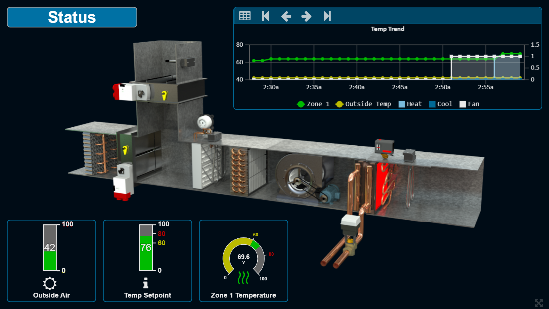 This second example shows how you can use this graphical interface to monitor equipment, such as a roof top unit, air handler unit, or boiler. BASview3 gadgets can be positioned in the appropriate locations around the equipment image to indicate important parameters. The equipment Status image shown was purchased from ControlPix and uploaded to the BASview3. The ControlPix image contains a detailed equipment depiction with animations on active elements dynamically driven by changes in point values, such as an active/inactive supply fan, neutral/red heating element, neutral/blue cooling element, open/closed damper at various positions as well as clean/dirty filter indication. BASview3 gadgets, such as a Trend Container and Arc and Bar Gauges, are freely positioned adjacent to the equipment image to indicate any current and historical point values of interest.