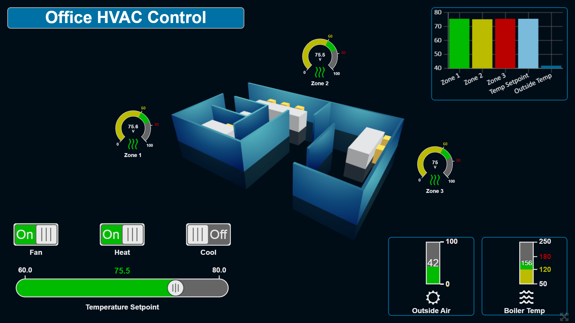 For example, the 3D floor plan for the Office HVAC Control image was imported into the BASview3 as a PNG image file, then several built-in BASview3 gadgets were freely positioned on top and around it. Then BACnet points were attached to each gadget using the menu.