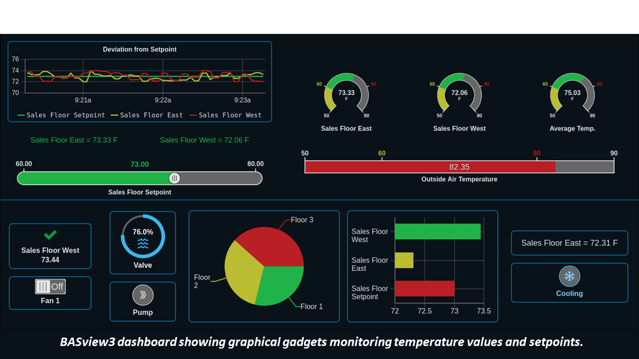 By supporting both traditional graphics and the dashboard, BASview3 can clearly display system information and simplify equipment monitoring and control. The BASview3 is ideal for small to medium buildings or processes that require a user-friendly graphical interface with no licensing requirements. The BASview3 can handle up to 2000 nodes–a combination of devices, points, schedules, alarms, trends, etc. Graphics can be purchased online from vendors, such as ControlPix.