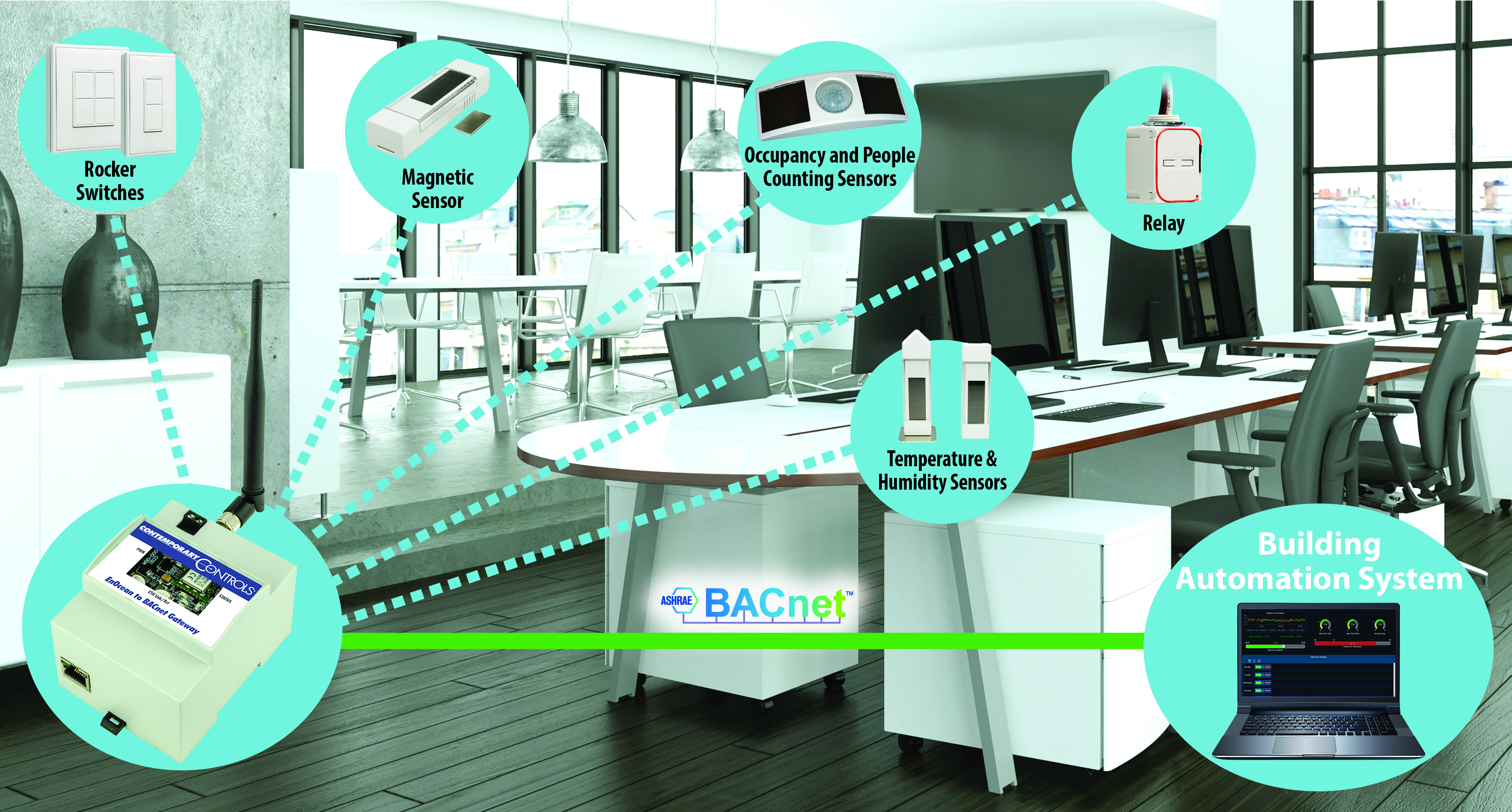 Contemporary Controls' EnOcean to BACnet gateways allow EnOcean input and output devices to be linked to and controlled by devices in the systems' BACnet network. © Contemporary Controls. Individual images of the rocker switches, magnetic sensor, occupancy and people counting sensors, relay, and temperature & humidity sensors are printed with permission from EnOcean GmbH. © 2024 EnOcean GmbH. All rights reserved.