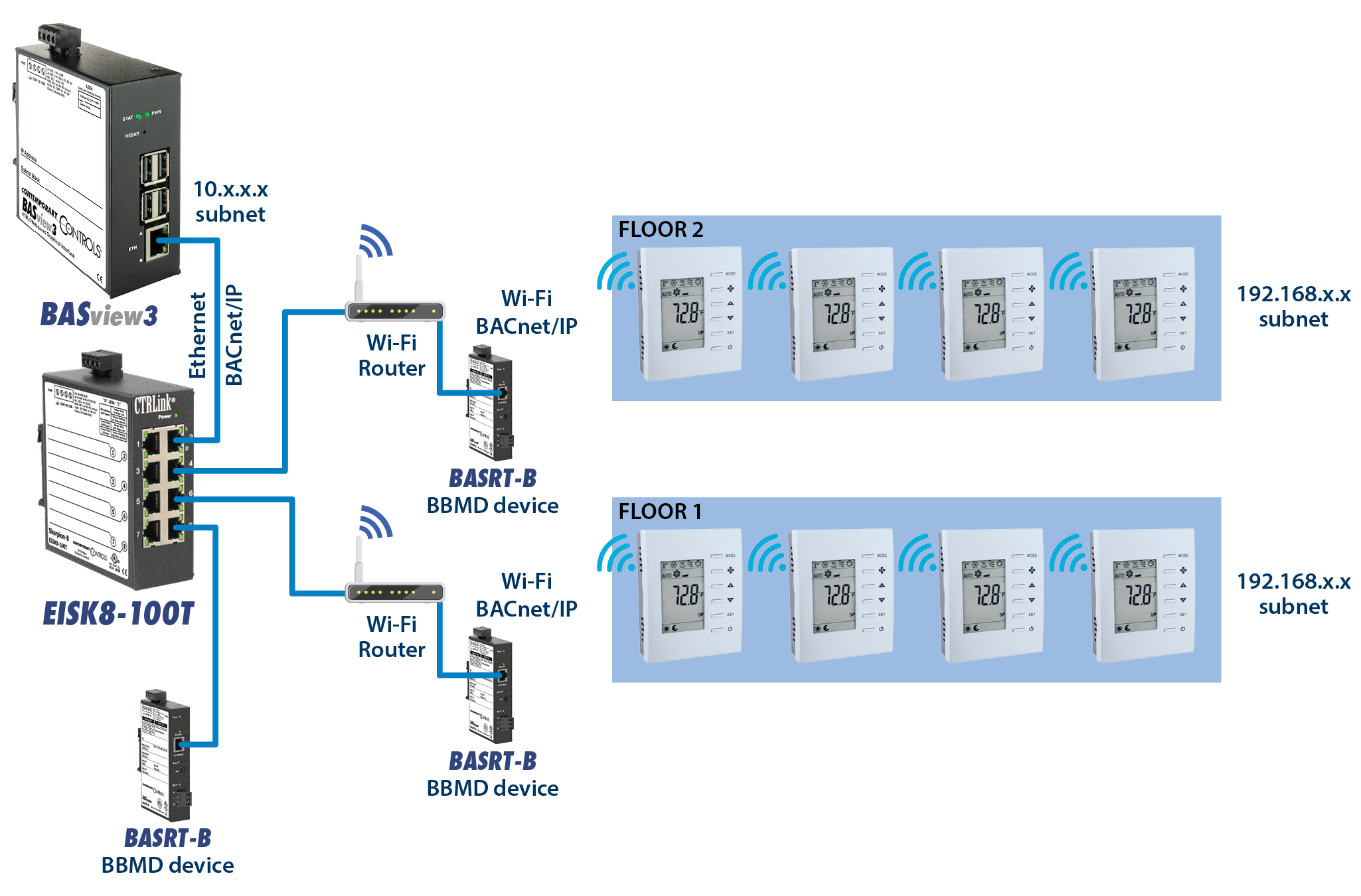 Using a Wi-Fi router creates an additional subnet between the wireless network and the wired Ethernet. As is usual for any BACnet communication over subnets, BBMD devices are required on each subnet. BBMDs are not required if a Wi-Fi Access Point, that extends the same subnet as the wired Ethernet, is used to integrate the wireless thermostats.