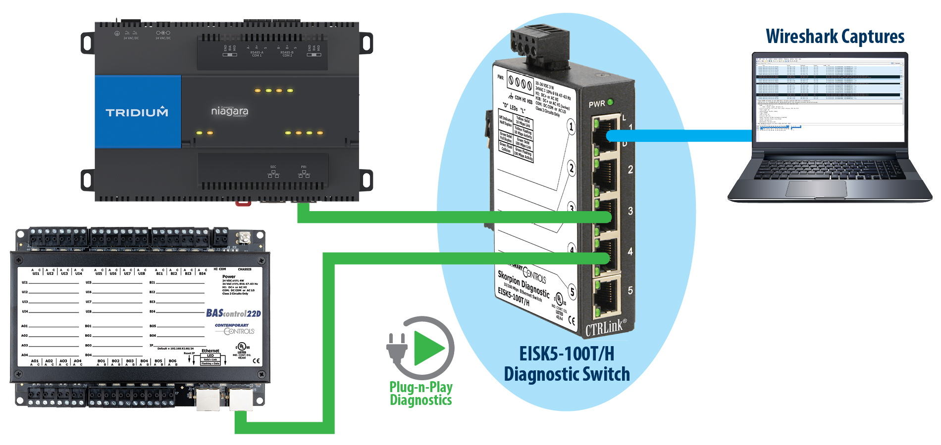 You can capture BACnet/IP messages using Contemporary Controls' Skorpion Diagnostic Switch that is connected to a PC running Wireshark. By placing the Diagnostic Switch between any BACnet/IP device and the rest of the network (as shown in Figure 1), you can capture transmitted or received BACnet/IP messages. These messages can provide a wealth of data for equipment vendors to help diagnose issues with the equipment in your facility. In Figure 2, all traffic to/from the controller is monitored, allowing you to analyze communication issues that may occur with the controller. In Figure 3, all traffic to/from the Jace is monitored, allowing you to analyze communication issues that may occur with the Jace.