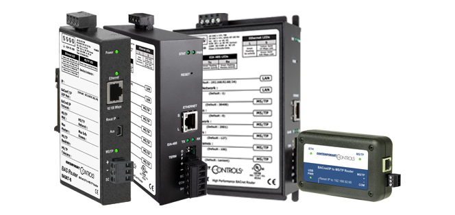 The BASrouters are multi-network routers used to route messages between BACnet/IP, BACnet Ethernet and BACnet MS/TP networks. Four versions are available—three DIN-rail mounted units for fixed installations and a portable unit for commissioning and troubleshooting.