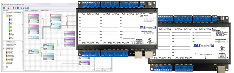 The BAScontrol Open Control Series utilizes BACnet/IP as an open communications protocol, Sedona for open visual control programming, and the BAScontrol Toolset for unrestricted use in program development and archiving. Ideal for unitary control of air-handlers (AHUs), fan coils (FCUs), and rooftop units (RTUs), these controllers are freely-programmable and customizable.